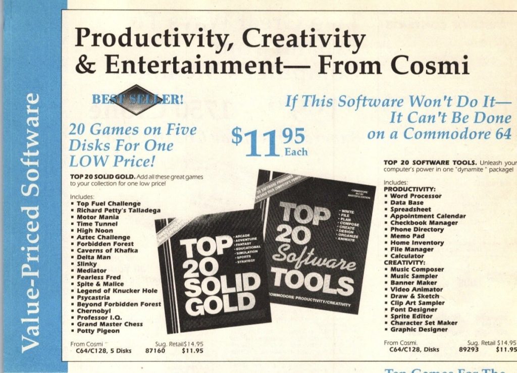 Just about every piece of commercial Commodore 64 software has been archived and preserved. One of the great things about owning this vintage machine (or buying the new Comodore 64 Ultimate) is that you have access to all of these titles! Just download and play! Except in the case of Top 20 Software Tools by Cosmi, that is. It was only kinda, sorta, less-than-halfway preserved online. I found a few online respositories that included disk 1 of the collection, and that was about it. All the good stuff: the sprite editor, and video animator, and sound composter, was on disk 2.