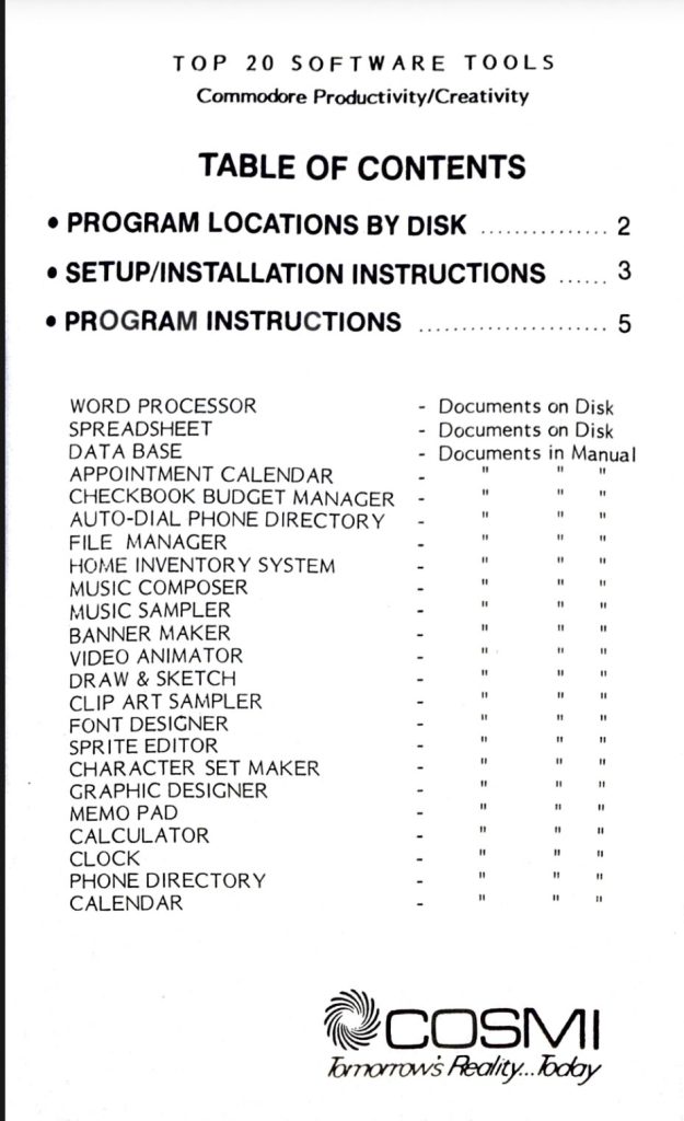 In the case of Top 20 Software Tools, this was 40 pages full of strangely typeset instructions. The margins were are all over the place. Sometimes the text starts so high on the page it’s almost cut off, and other times the text looks like it was printed slighty slanted. Despite this, It’s all readable, though. Interestingly, the cover of the booklet indicates instructions for every program is included in the manual EXCEPT for the Word Processor and the Spreedsheet. Those instruction documents are included on disk. Whoops.